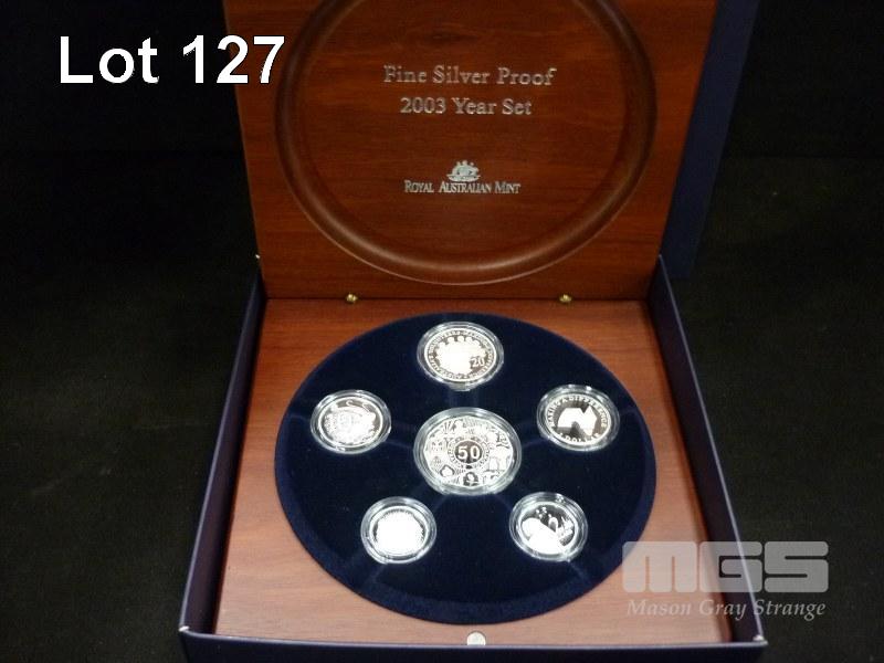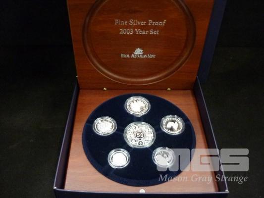 2003 FIRST ISSUE, FINE SILVER (99.9%) PROOF COIN SET, TIMBER BOX, COMMEMORATIVE 20 CENT, 50 CENT, $1, #839