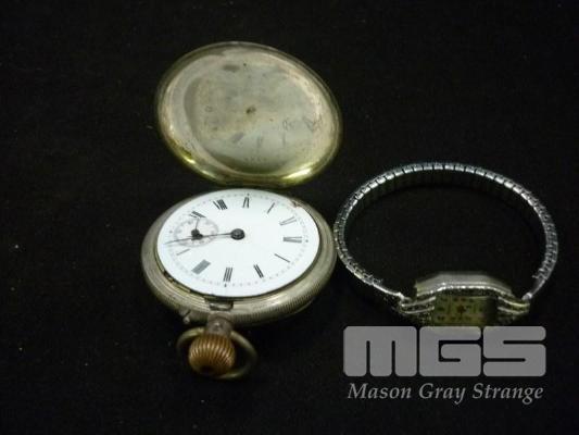 SILVER CASED FOB WATCH, WITH ENAMEL DIAL & SHIELD MOTIF & MARCASITE LADIES WATCH