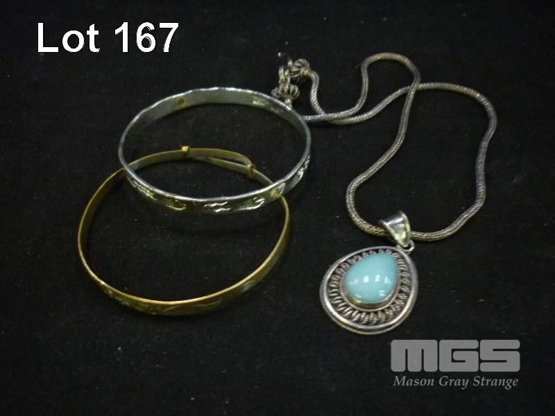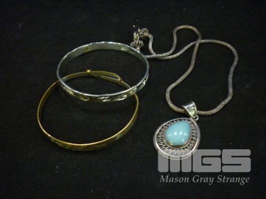 SILVER PENDANT WITH NECKLACE, MARKED 925, & 2 X SILVER BANGLES MARKED 925
