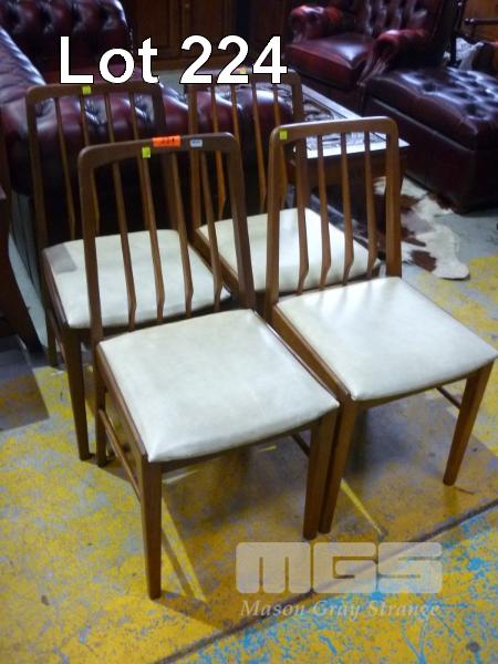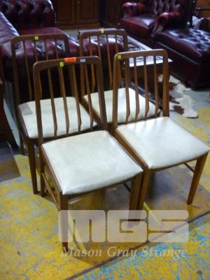 SET 4 TH BROWN TEAK FRAMED DINING CHAIRS, BEIGE VINYL, 1 x BACK SLAT, ALL FAULTS