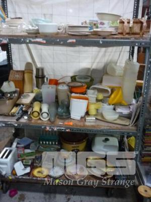 ASSORTED CERAMICWARE, KITCHEN PLASTIC STORAGE, UTENSILS, CUTLERY, ETC, 3 x BAYS