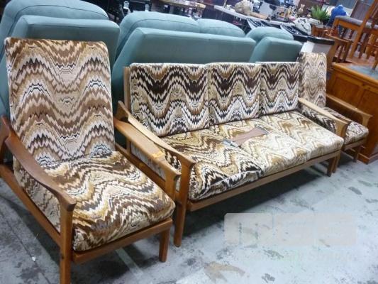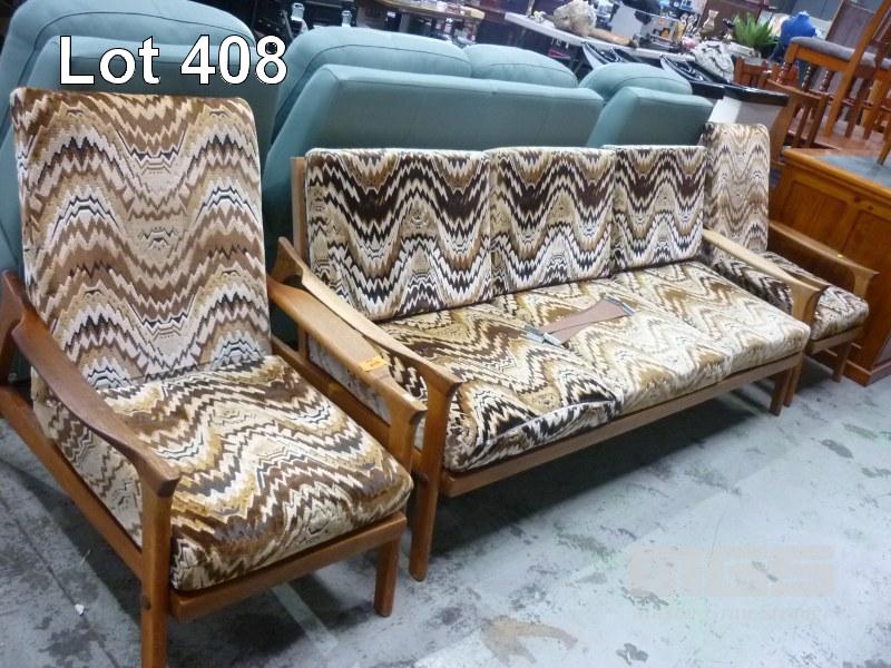 ART DECO TIMBER FRAME, BEIGE/BROWN CUSHION, 3 PIECE LOUNGE SUITE, INCLUDING 3 SEATER & 2 x SINGLES