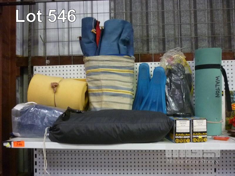 ASSORTED CAMPING, FLIPPERS, MASKS, INFLATABLE MATTRESSES, ETC
