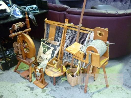 ASSORTED WOOL PROCESSING & KNITTING SUPPLIES, LOOMING FRAME, SPINNING WHEEL, DETANGLER, ETC