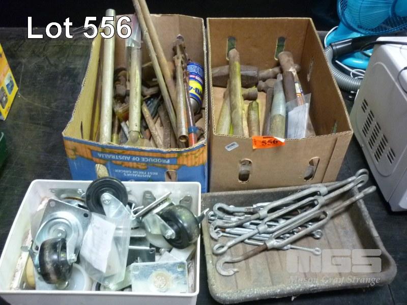 4 x BOXES ASSORTED HAMMERS, TOOLS, TENSIONERS & CASTOR WHEELS