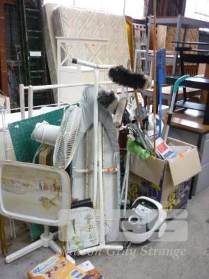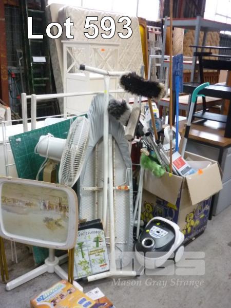 ASSORTED CLEANING SUPPLIES, MOPS, BROOMS, STICK VAC, IRONING BOARD, FAN, ETC