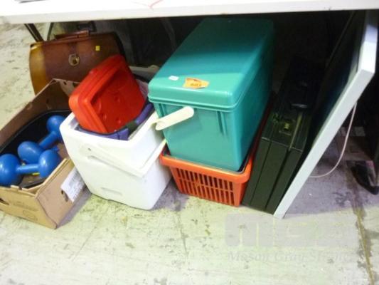 WEIGHTS, ESKY, BRIEFCASE, ART & CARRY BASKETS