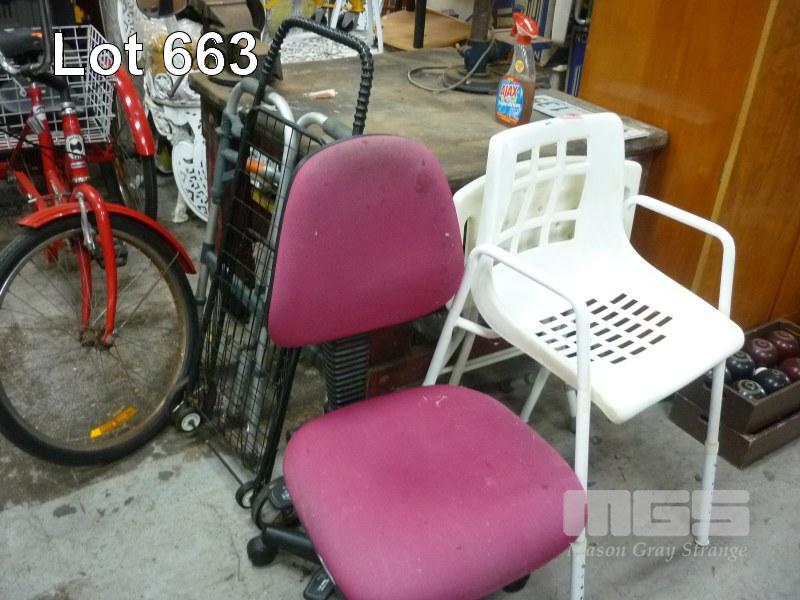 2 x ASSIST CHAIRS, FOLD UP MOBILITY WALKER & SHOPPING TROLLEY