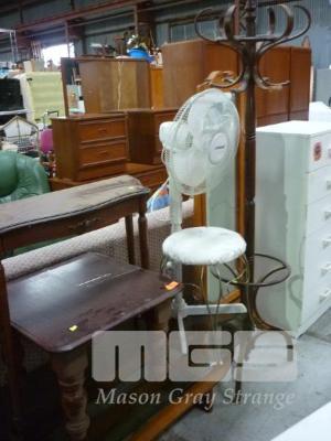 7 x PIECES FURNITURE, COFFEE TABLE, GLASS TOP BENTWOOD, PEDESTAL FAN, CHEVAL MIRROR, DRESSER CHAIR, COAT/HAT STAND, SIDE TABLE & HALL TABLE