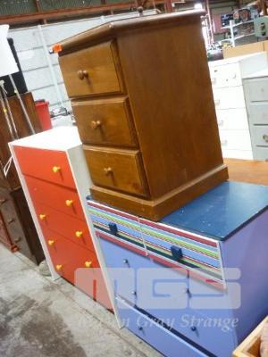 WHITE LAMINATE RED DRAWER TALLBOY, (MISSING HANDLES), BLUE CHEST OF 5 DRAWERS, (BOTTOM RAIL REQUIRED REPAIR) & PINE BEDSIDE CABINET