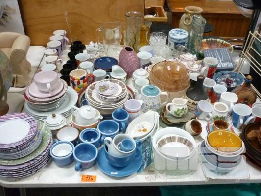 ASSORTED DINNERWARE, CUPS, ETC, 1 x TABLE