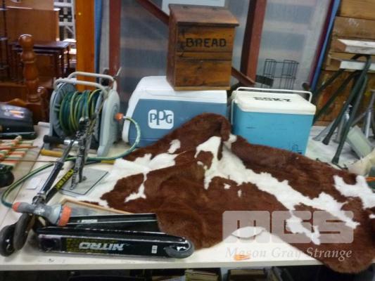 VINTAGE ESKIES, 2 x RAZOR SCOOTER, HOSE REEL, COW RUG ETC