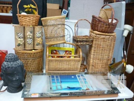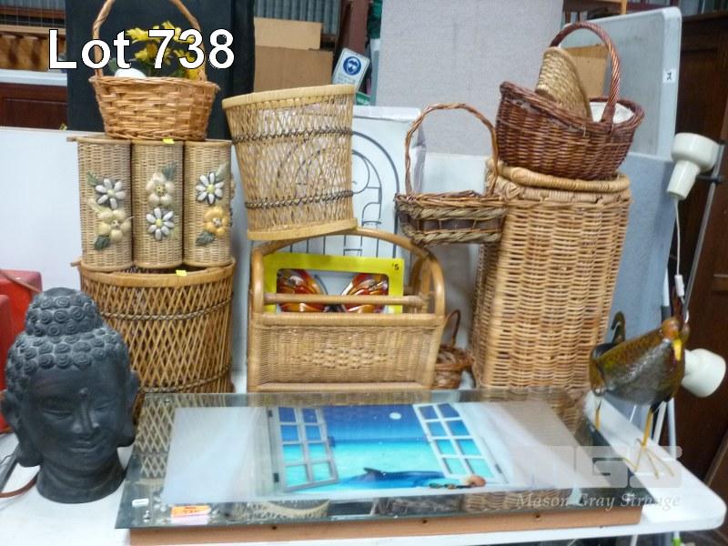 ASSORTED WICKER BASKETS, ILLUMINATED WALL ART, ETC, 1 x TABLE