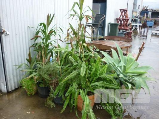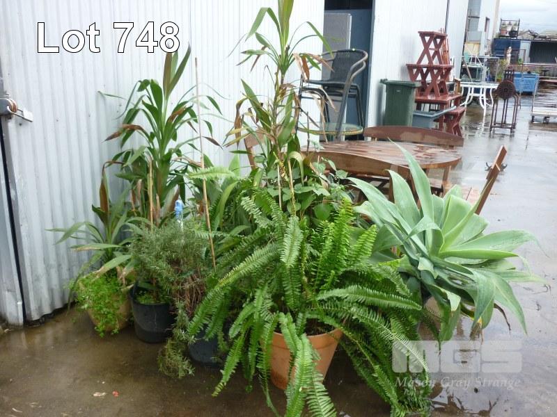 ASSORTED POTTED PLANTS INCLUDING AGAVE, SWORD FERN, ROSEMARY, ETC