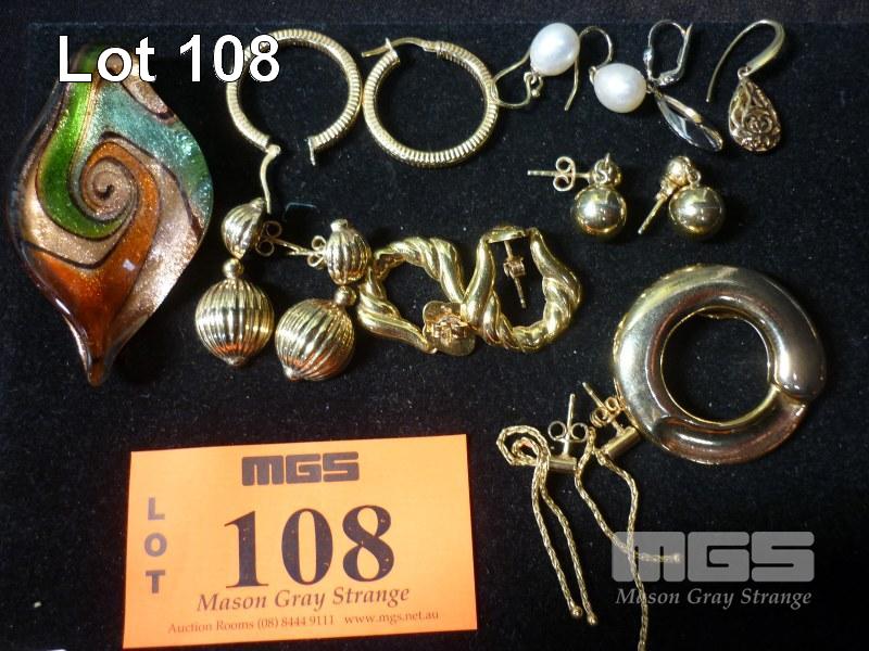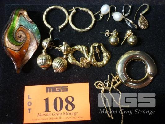 ASSORTED GOLD, GOLD PLATED, SILVER EARRINGS GLASS PENDANT, SCARF CLIP