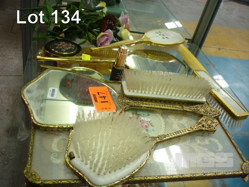 ASSORTED VINTAGE VANITY SET MIRRORS, BRUSHES, CERAMIC FLOWERS, ETC