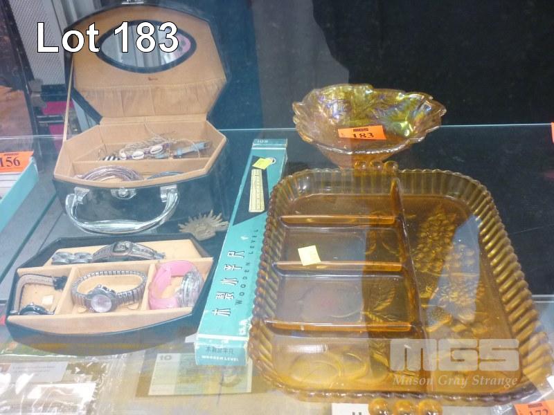 ASSORTED BANGLES, WRIST WATCHES, AUSTRALIAN MILITARY FORCES HAT BADGE, WOODEN LEVEL, CARNIVAL GLASS BOWL & AMBER GLASS TRAY