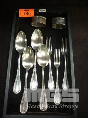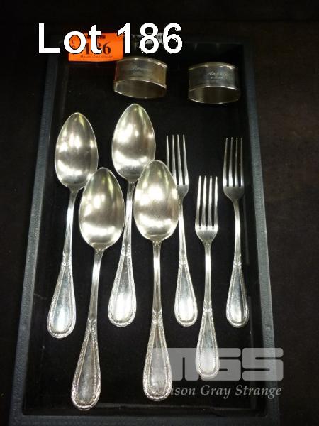 4 X STERLING SILVER SPOONS, MARKED 800, 3 X STERLING SILVER FORKS MARKED 800 & 2 X STERLING SILVER NAPKIN RINGS MARKED 925
