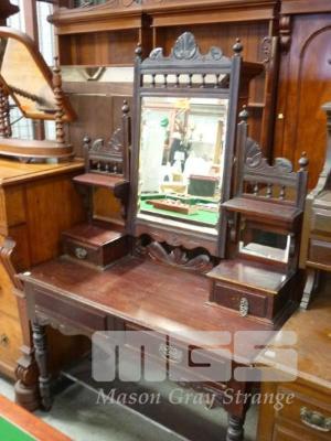 TIMBER DRESSER, 4 x DRAWER, (1 x HANDLE MISSING), BEVELLED TILT MIRROR, STRETCHER BASE, PORCELAIN CASTORS