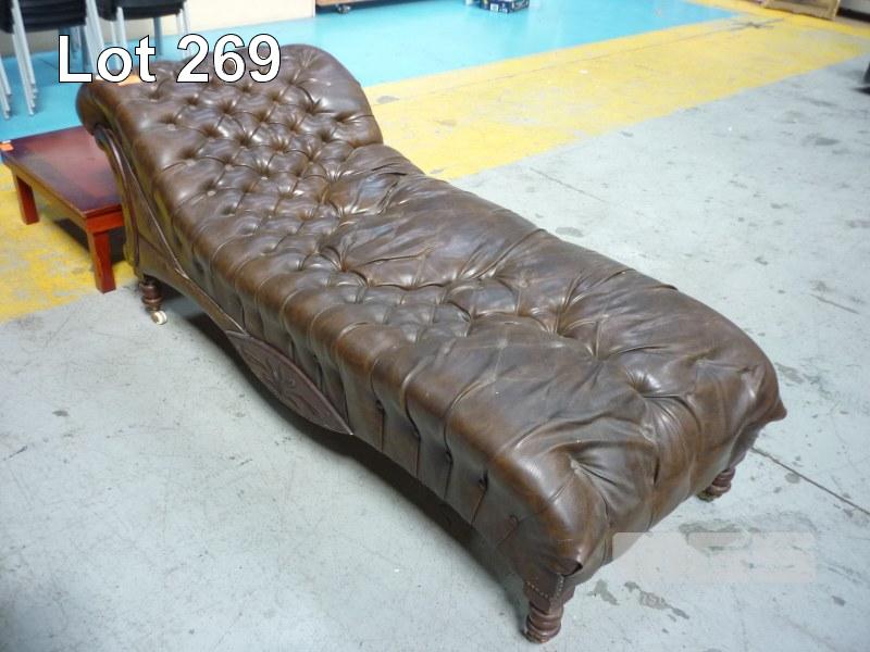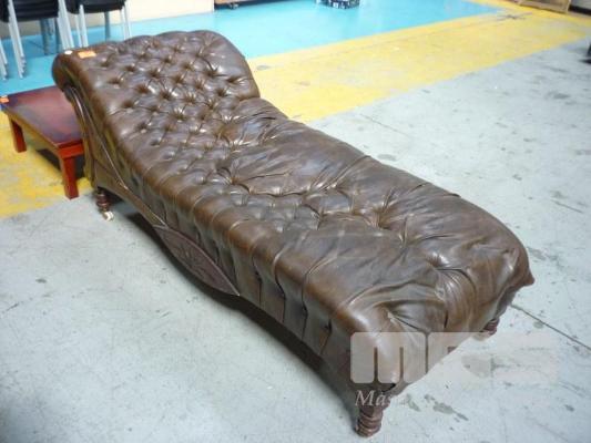 BROWN LEATHER LOVERS LOUNGE, DEEP BUTTON, PORCELAIN CASTORS (SOME BUTTONS MISSING)