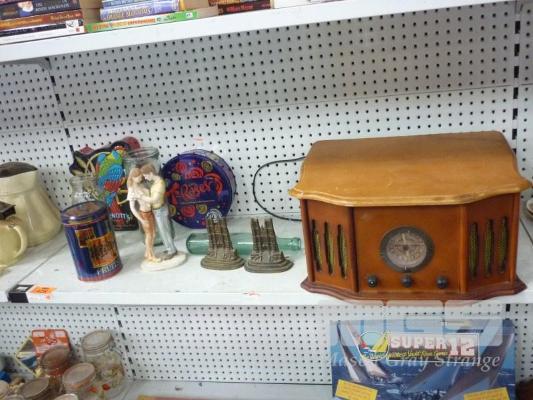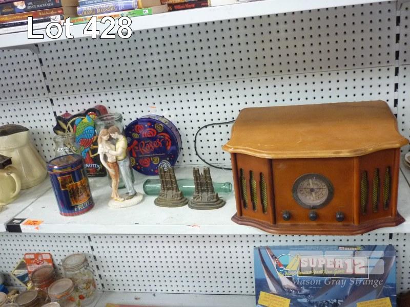 COLLECTION ARNOTTS TINS, TORPEDO BOTTLE, CAST BOOK END, RECORD PLAYER, JAR, ETC
