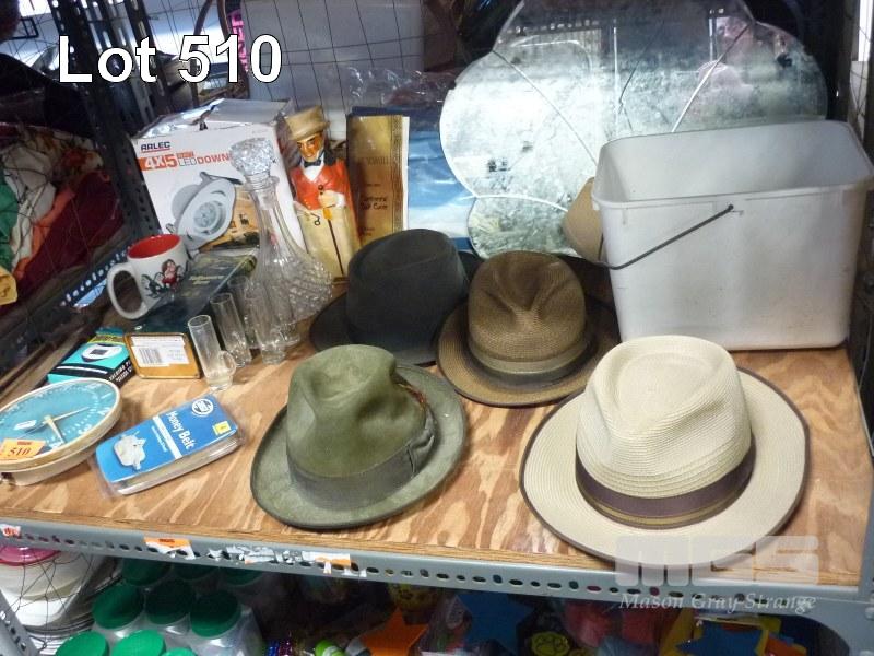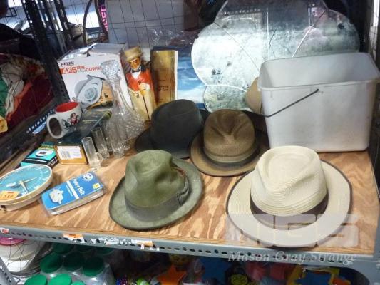 ASSORTED MENS HATS, ART DECO MIRROR, DECANTER, ETC