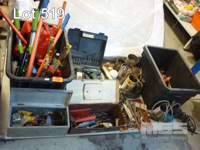 BOSCH ELECTRIC DRILL, MAKITA JIGSAW, RYOBI CORDLESS DRILL/BATTERY/CHARGER, ASSORTED HAND & GARDEN TOOLS