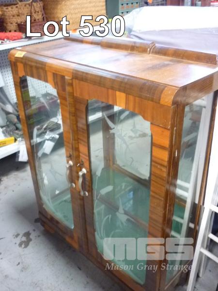 ART DECO, TIMBER VENEER DISPLAY CABINET, MIRROR BACK, ETCHED GLASS, 2 x GLASS SHELVES