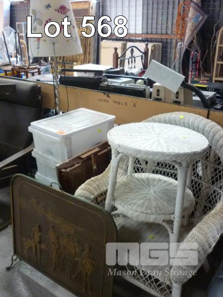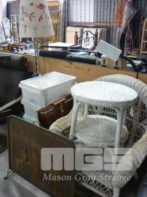 WHITE WICKER ARM CHAIR, SIDE TABLE, FOLDING TABLE, BRASS EMBOSSED FIRE SCREEN, DRAWER UNIT & STANDARD LAMP