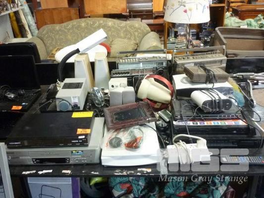 ASSORTED VCR'S, HD RECEIVERS, PORTABLE STEREOS, RADIOS, SPEAKERS, ETC, 1 x TABLE