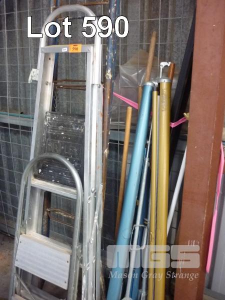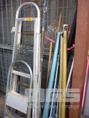 2 x LADDERS, STEP LADDER, PROJECTOR SCREENS & GARDEN TOOLS