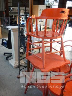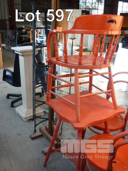 RED PAINTED TIMBER CHAIRS, OCCASIONAL TABLE, PAINTERS EASEL, CANDELABRA, POT STAND, PEDESTAL FAN & GOLF CLUBS