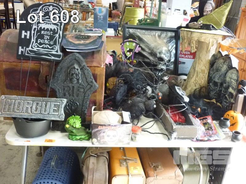ASSORTED HALLOWEEN DECORATIONS, PAPER MACHE, RUBBER MASKS, ETC 1 x TABLE