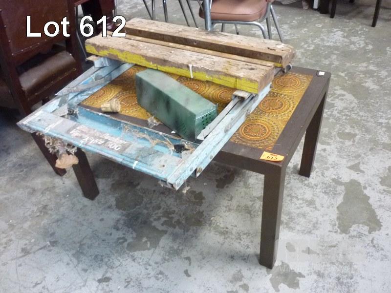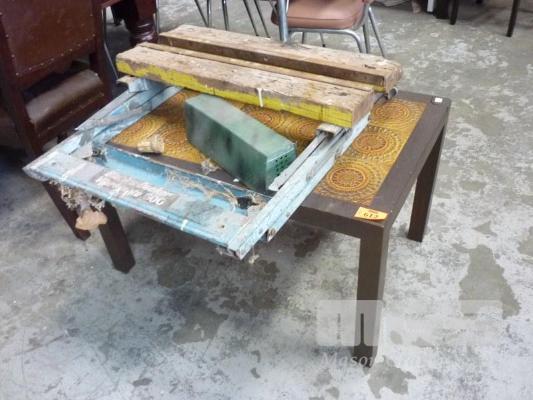 TABLE WITH TILED TOP AND A BLACK AND DECKER WORKMATE 600