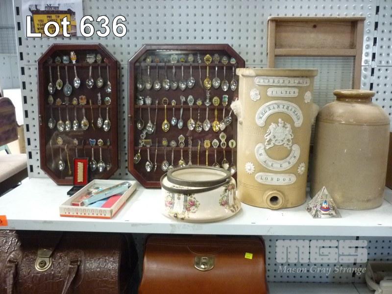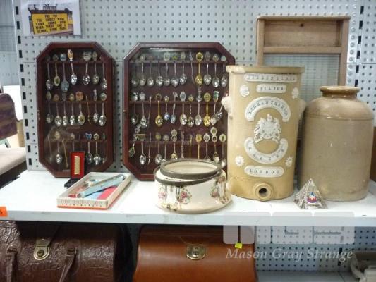 SOUVENIR SPOONS, DISPLAY CASES, WASHBOARD, STONEWARE JUG, ETC