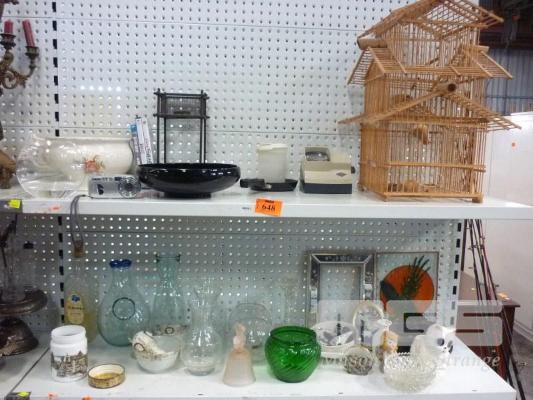 TIMBER BIRD CAGE, VASES, BOWLS, ETC, 2 x SHELVES