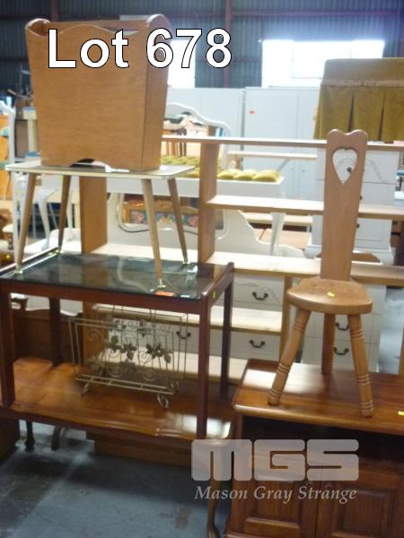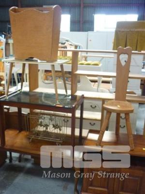PINE COFFEE TABLE, GLASS TOP COFFEE TABLE, LAMINATE TOP COFFEE TABLE, PINE ENTERTAINMENT UNIT, 3 LEG CHAIR & 2 x MAGAZINE RACKS
