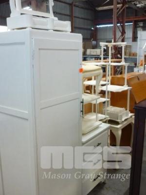 WHITE PAINTED TIMBER SIDE TABLE, VANITY MIRROR, 4 x WHATNOTS, FOOT STOOL, DRESSER & SMALL SHELF UNIT