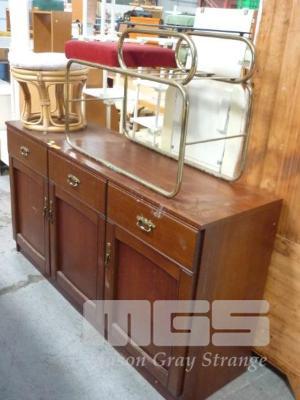 TIMBER VENEER SIDEBOARD, METAL FRAME TELEPHONE TABLE & CANE FOOT STOOL