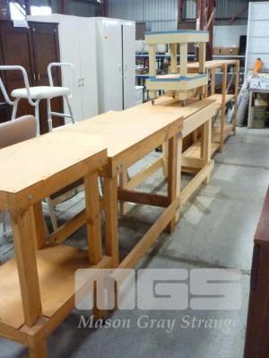 2 x TIMBER WORK BENCHES, 2 x MOBILE WORK BENCHES & TIMBER SHELF UNIT