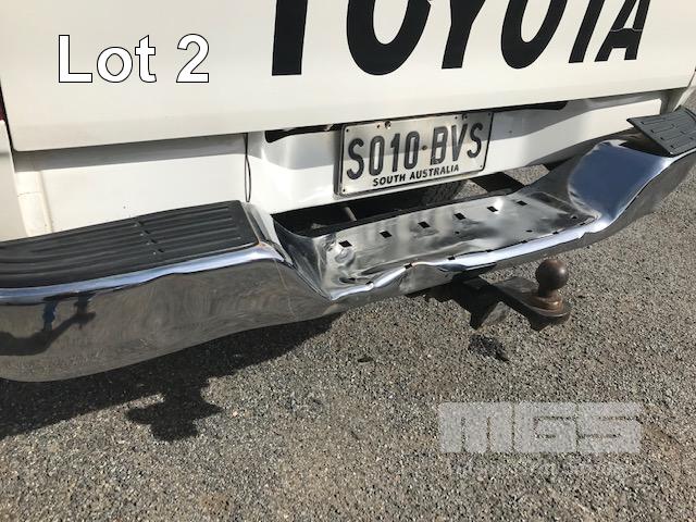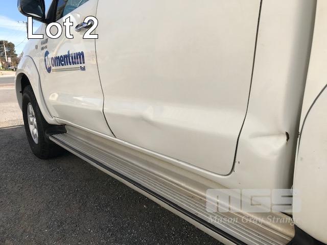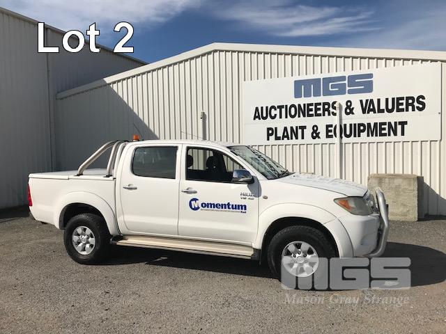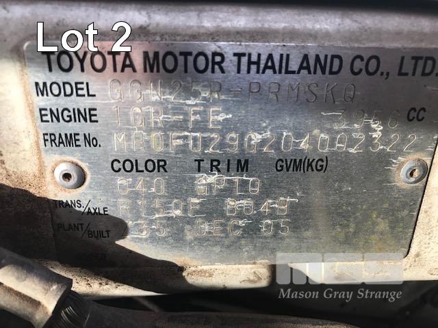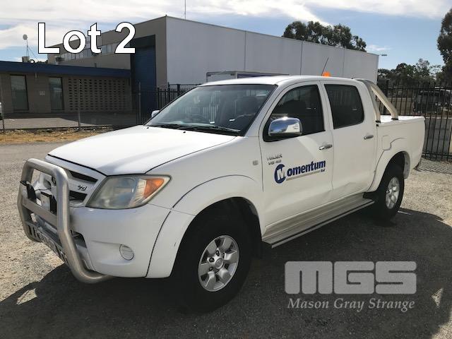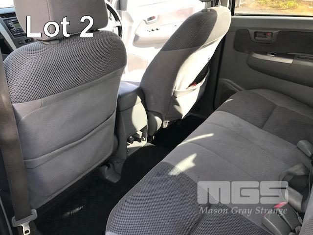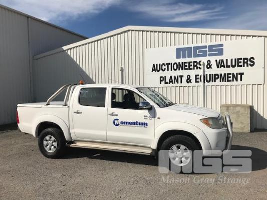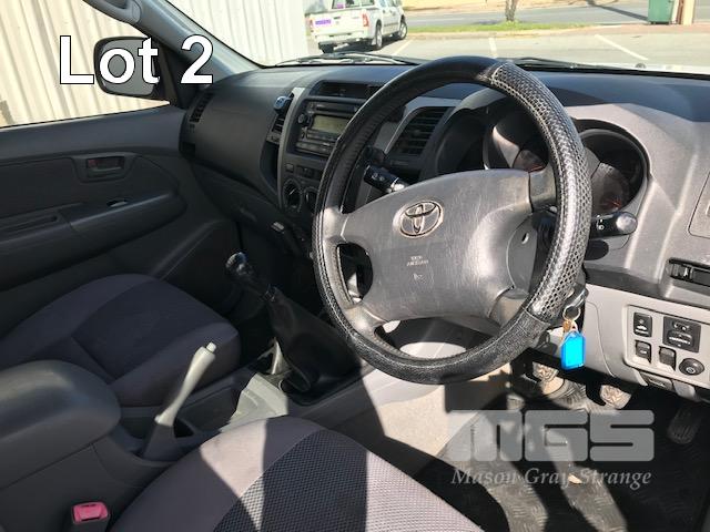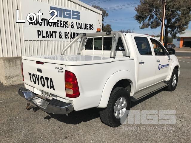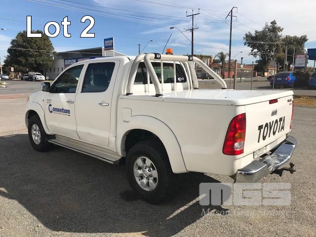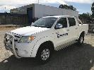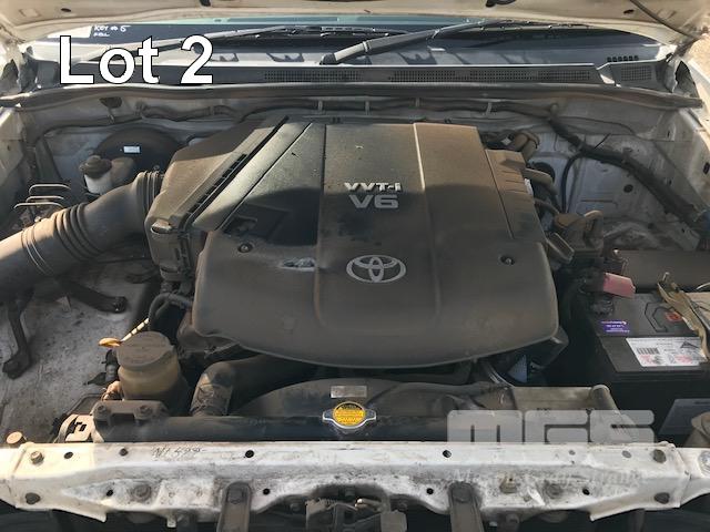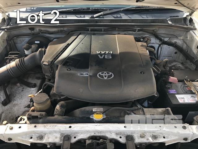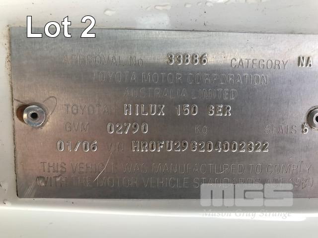 2005 TOYOTA HILUX GGN25R SR5 150 SERIES DUAL CAB TUB UTE 4x4 REG: S010 BVS VIN: MR0FU290204002322 ODO: 462,251kms SHOWING 4 LITRE V6, 5 SPEED MANUAL TRANSMISSION, PETROL, WHITE DUCO, 4 DOORS, 5 SEAT, 4x4 ABS, AIR BAG, AIR CON, BLUETOOTH, CD PLAYER, CENTRAL LOCKING, DECALS, NUDGE BAR, POWER STEERING, POWER WINDOWS, SIDE STEP, SPOT LIGHTS, TOW BAR, WARNING LIGHTS, ALLOY 15" WHEELS SPORTS BAR HARD COVER CB RADIO TUB LINER TIE DOWN POINTS KEY #5 (REG PAPERS TO COME) (WITH 1 KEY/S) CONDITION: PASSENGER SIDE DOORS & PILLAR - DENTS - SCRATCHES & CHIPS REAR STEP - DENTS FRONT CUP HOLDERS & ASHTRAY - DAMAGED