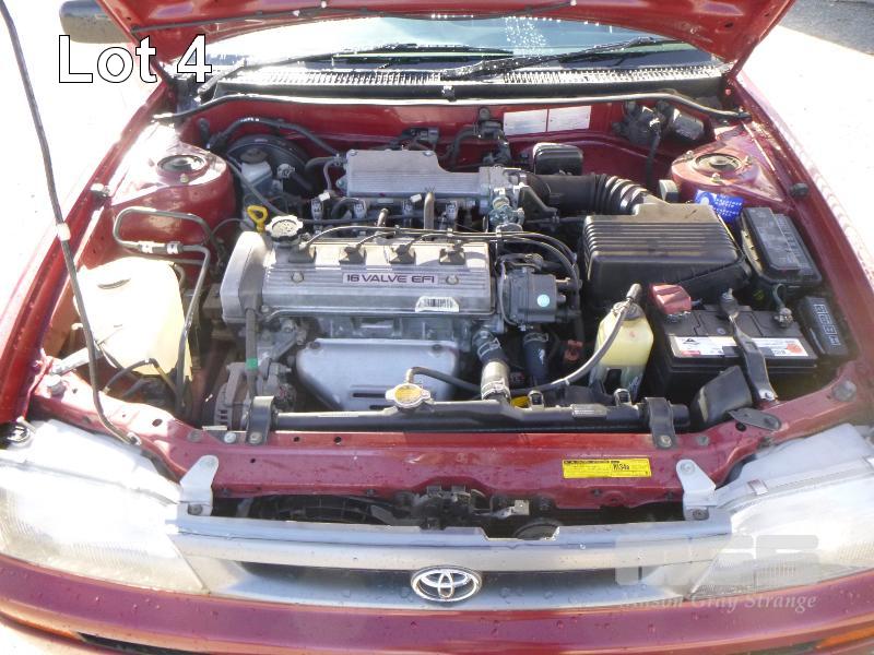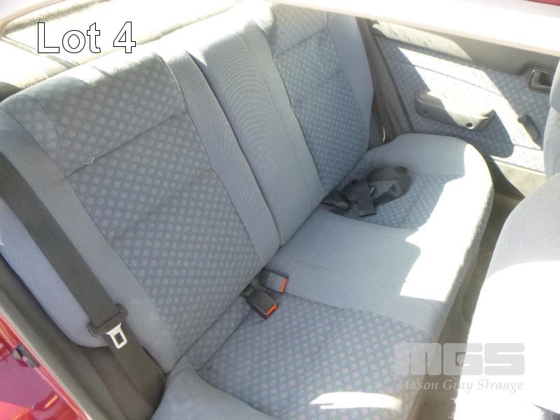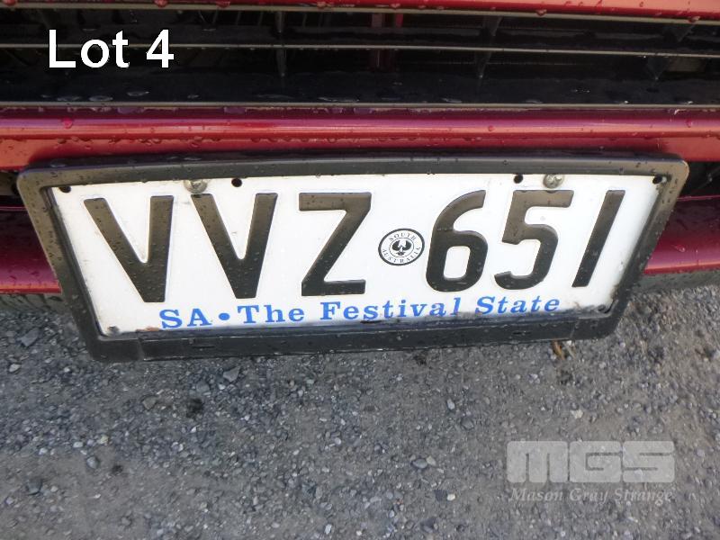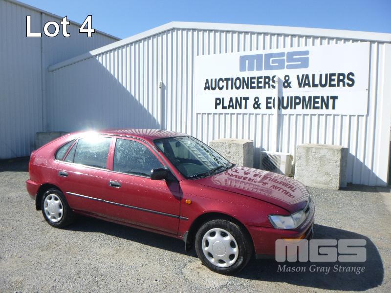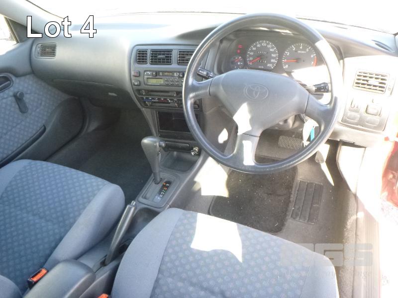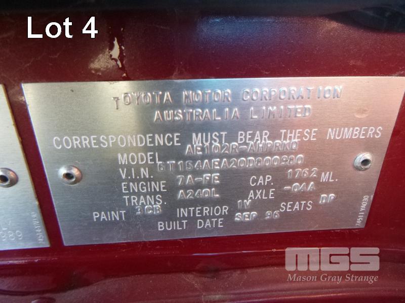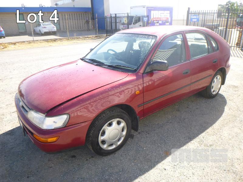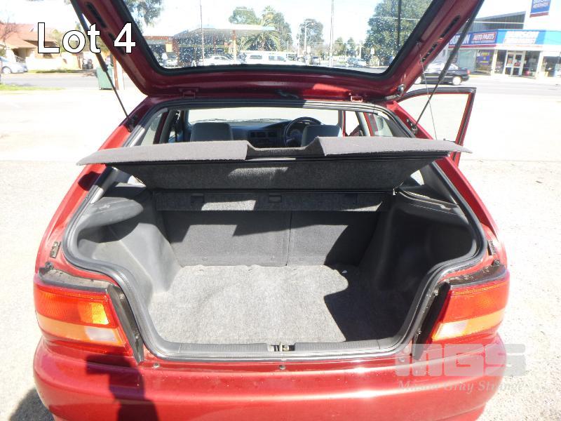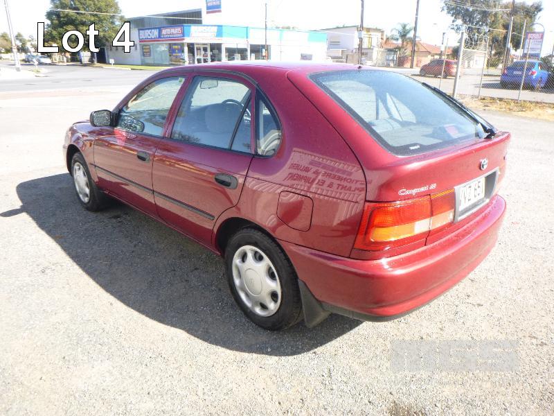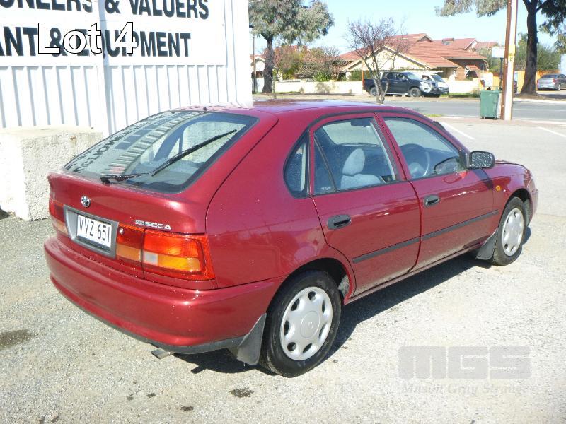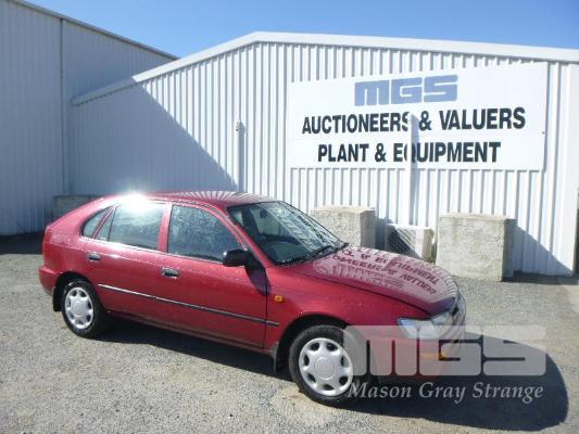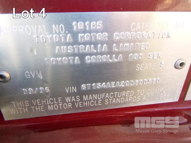 1996 TOYOTA COROLLA SECA 100 HATCH REG: VVZ 651 (SA) VIN: 6T154AEA20D800980 ENG: 7A9025985 ODO: 27,501kms SHOWING 1.8 LITRE, 4 CYLINDER, 3 SPEED AUTOMATIC TRANSMISSION, PETROL, MAROON DUCO, 4 DOORS, 5 SEAT, FWD CENTRAL LOCKING, IMMOBILISER, POWER STEERING, SPARE WHEEL, REGISTRATION PAPERS TO COME KEY #11 (WITH PAPERS, WITH 1 KEY/S, WITH OWNER'S MANUAL, WITH SERVICE BOOKS) CONDITION: ROOF LINING - LOOSE HUB CAP - SCRATCHED