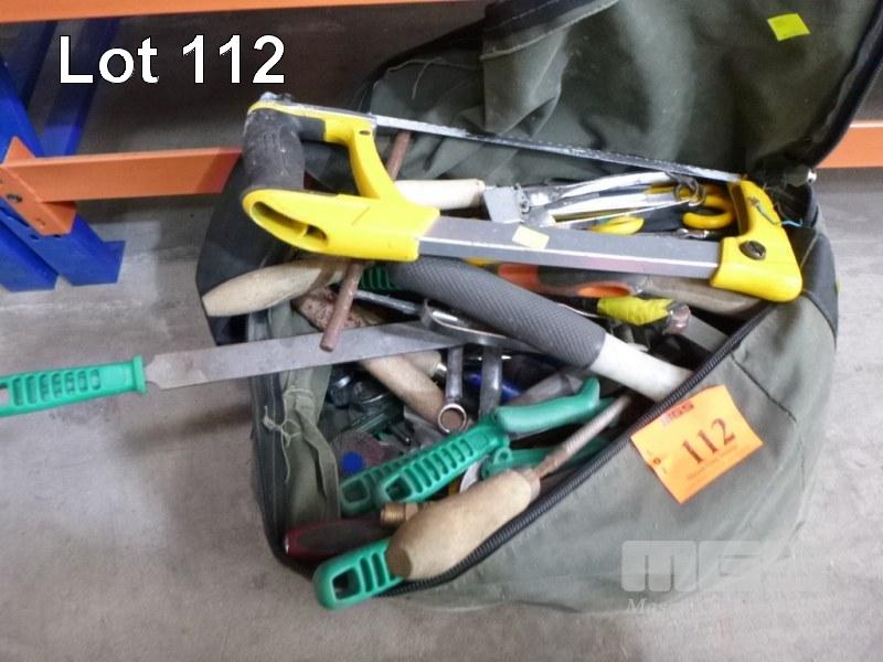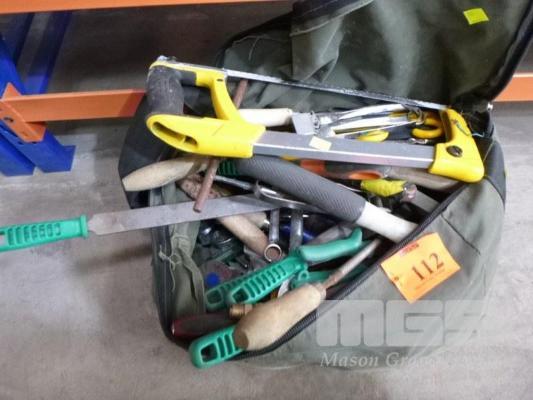 TOOL BAG & CONTENTS, FILES, HACKSAW, HAMMER, RIVETER, SPANNERS, SNIPS, SOCKET WRENCH, ETC