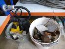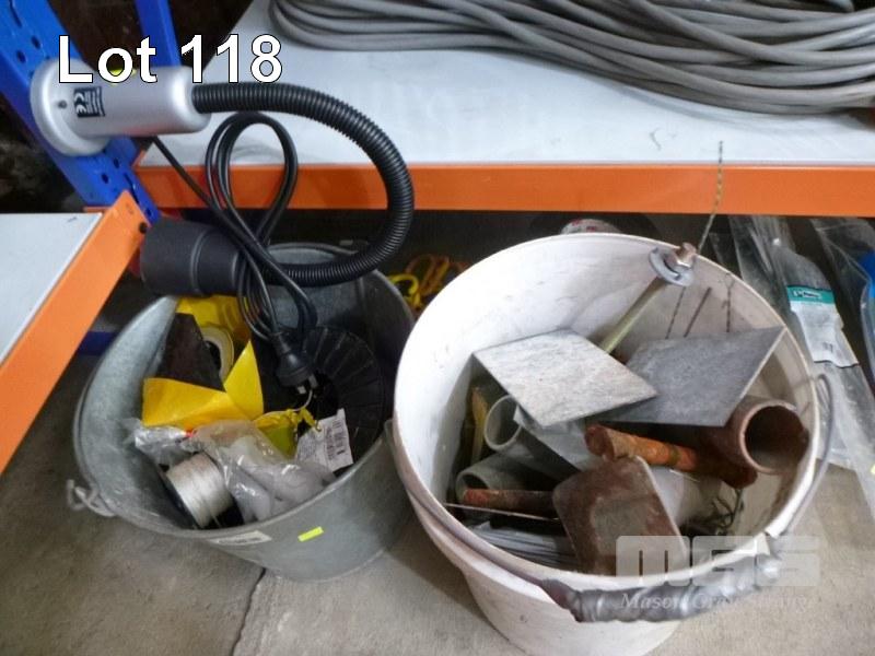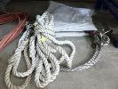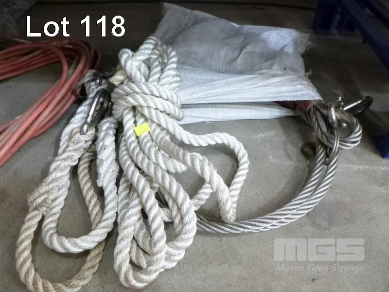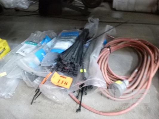 STAINLESS STEEL ROPE & NYLON ROPE WITH CARIBINERS, CABLE TIES, EXTENSION LEAD, 240V, TORCH, MAGNETIC LAMP, TAPE & METAL OFFCUTS, CONTENTS UNDER SHELF