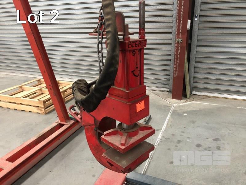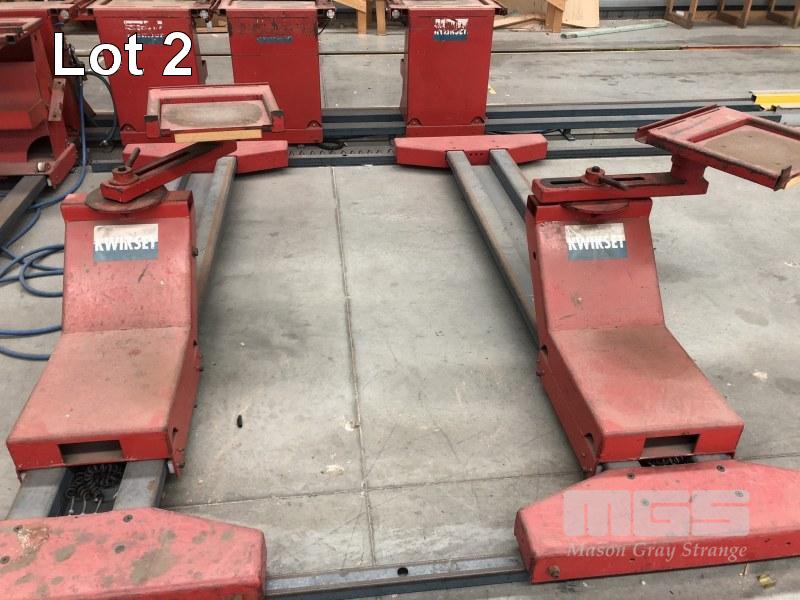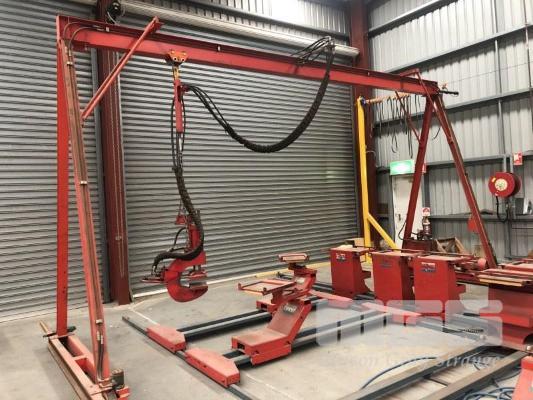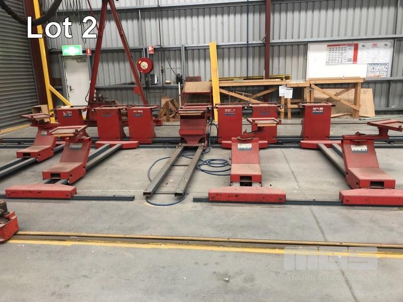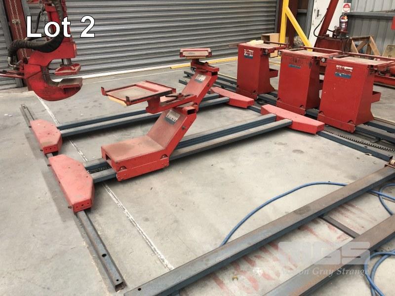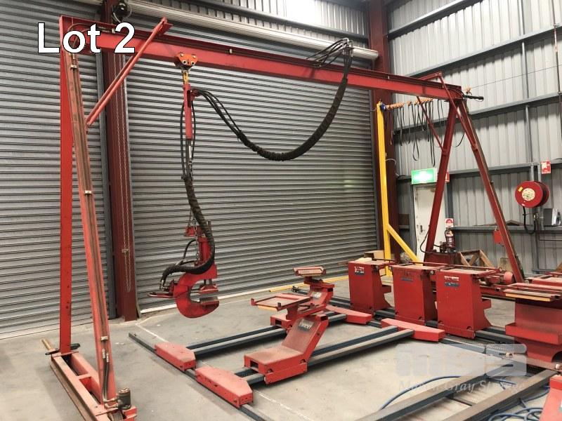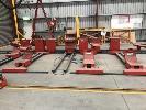 PRYDA TRUSS JIG & GANTRY PRESS INCLUDES PRYDA TRAVEL GANTRY NTH-STH TRAVEL 415V HYDRAULIC POWER PACK FOR TRAVEL & CLAMP 10.5m OF GANTRY RAIL WITH KWIKSET 7 x PEDESTAL BASE JIGS 4 x TRAVEL JIGS 1 x FIXED CENTRE JIG, ADJUSTABLE HEIGHT PNEUMATIC LOCK CONCERTINA CABLE INCLUDED WITH 1 POST