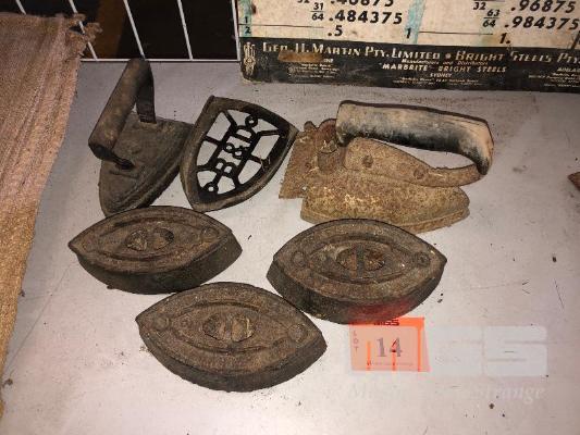 5 OLD IRONS, INCLUDES B&D BASE , WITH 1 EARLY ELECTRIC IRON. , 240V