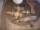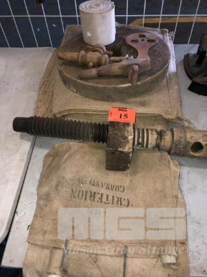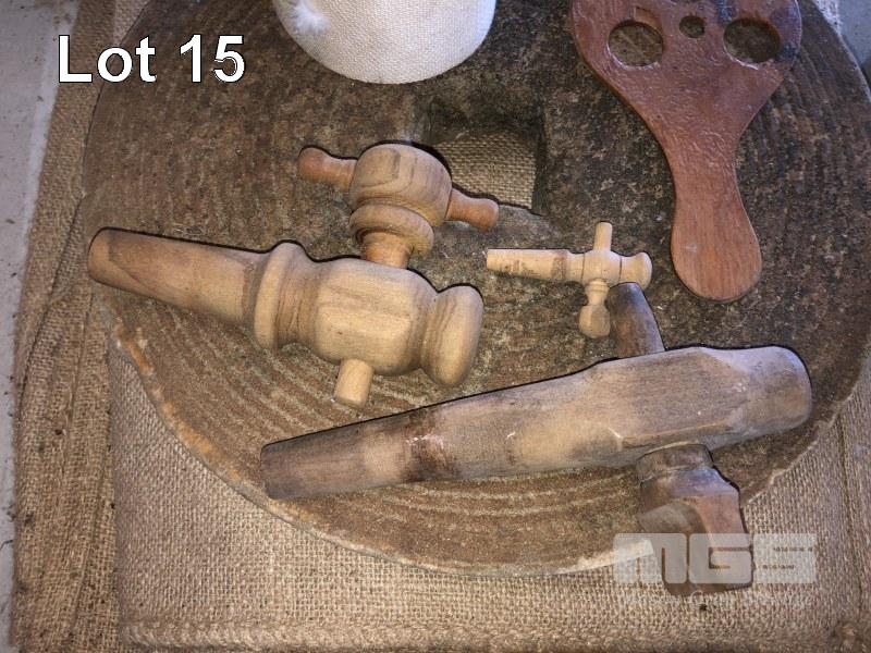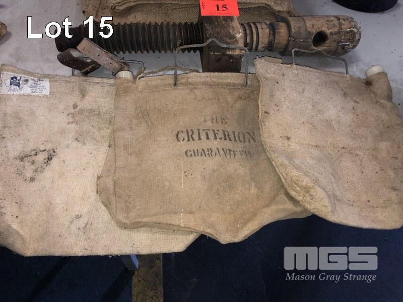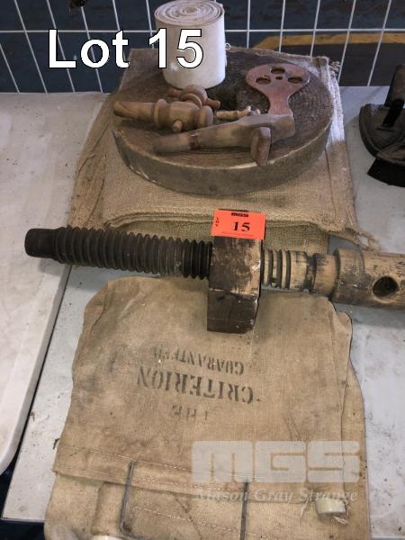 3 CRITERION CANVAS WATER BAGS, OLD GRIND STONE, 2 WOODEN KEG TAPS, WOOD SCREW & HESSIAN BAGS