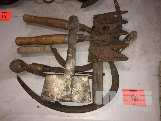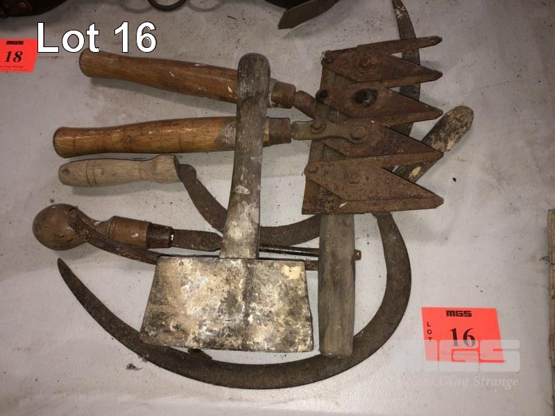 OLD GARDEN HAND TOOLS, 2 SCYTHES, 1 HEDGE CLIPPER, MALLET AND SCREW DRIVER.