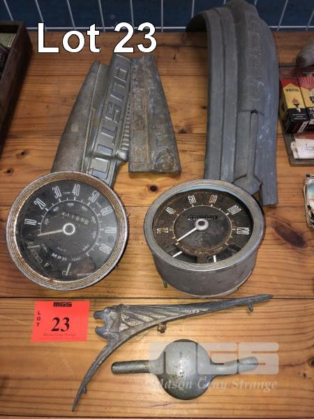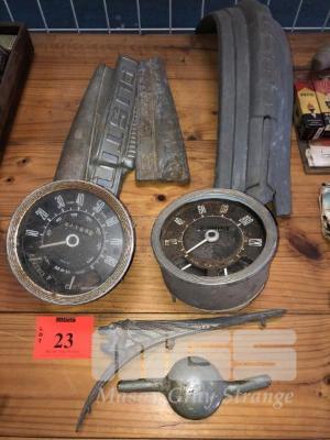 CAR PARTS INCLUDING, 2 SPEEDOS, VARIOUS TRIM PARTS, AUSTIN & FORD BODY TRIM & TANK CAP