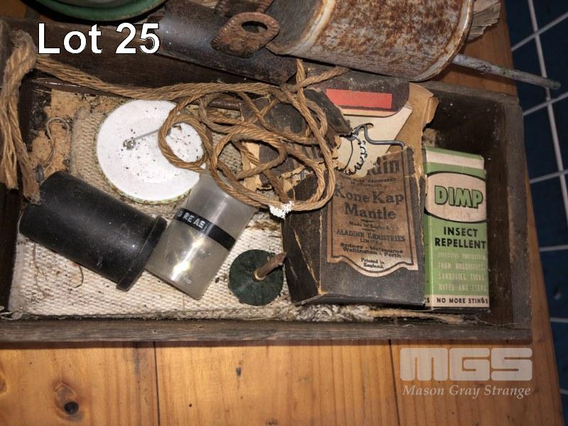 3 x KEROSENE LAMP TANKS WITH WICK MECHANISMS, OLD TINS, VARIOUS HANDLES & INSECT REPELLENT, WOODWORKERS HAND BOOK.